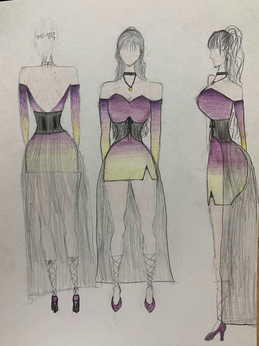 씨스루 천이 달린 원피스에 코르셋이 포인트인 의상입니다. 긴장갑을 끼고, 헤어는 반묶음 입니다.