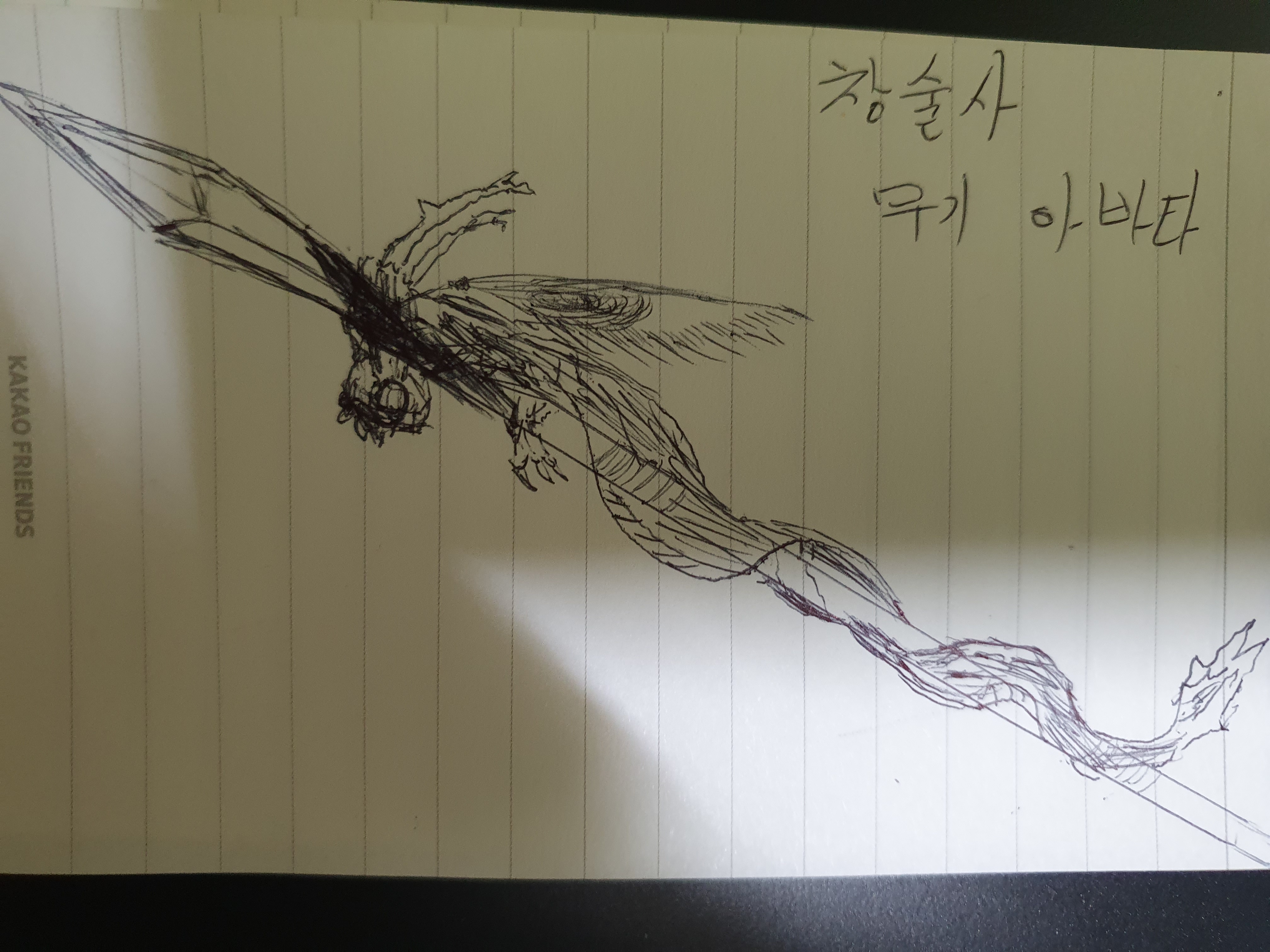 스피어에 용과 봉황의 깃털이 휘감고 있다 월래는 용입에서 창 끝이 나오는것을 표현하고 싶었지만 그림실력이 딸려서 패스 실력자를 기다리며 용 과같은 상상력으로~ 봉황을 기다리며