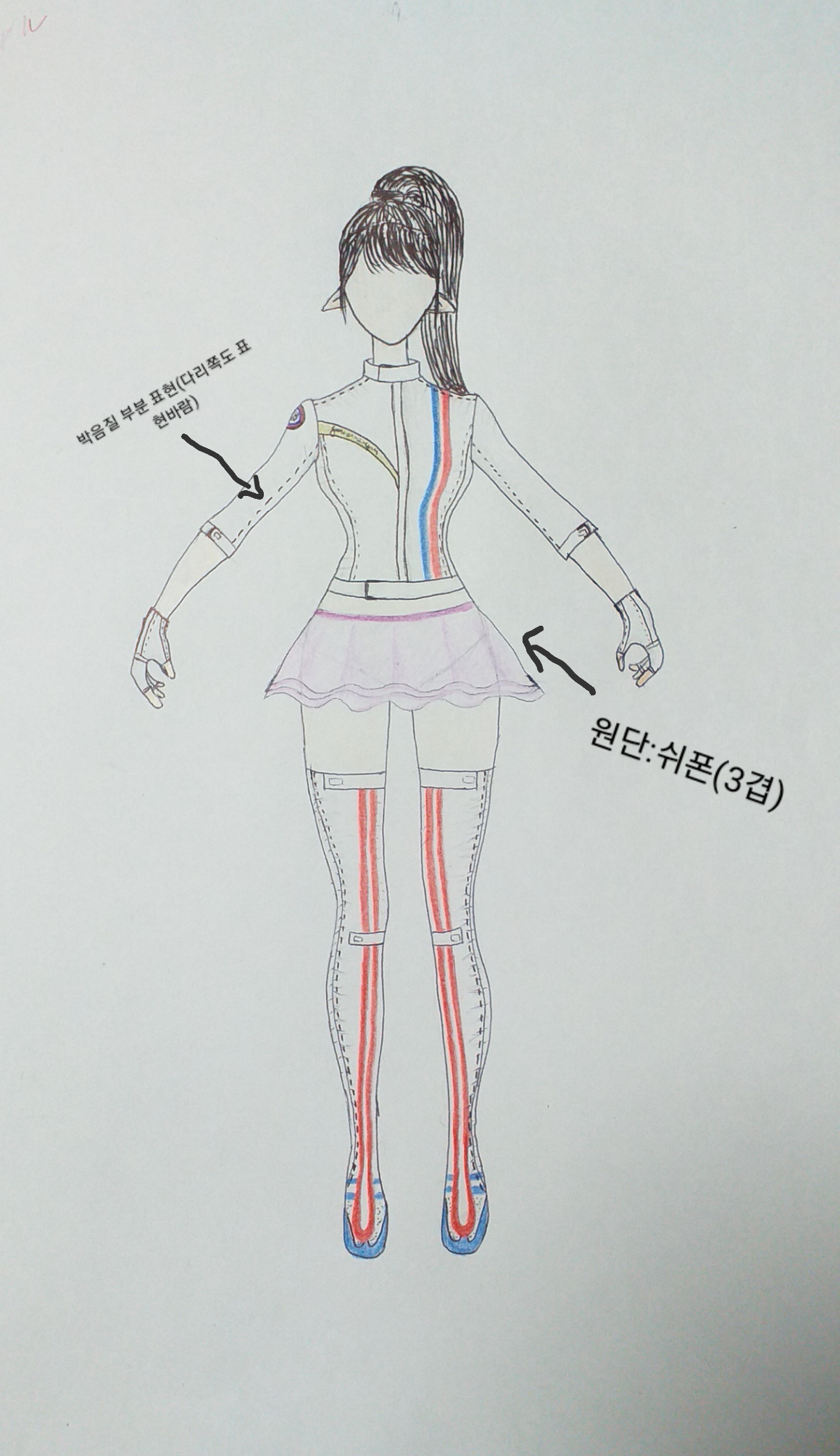 치마는 여성스럽고 부츠.자켓은 강해보여 서로 반대의 느낌이지만 그게 오히려 더 잘어울릴수 있단 생각으로 그려봣어요