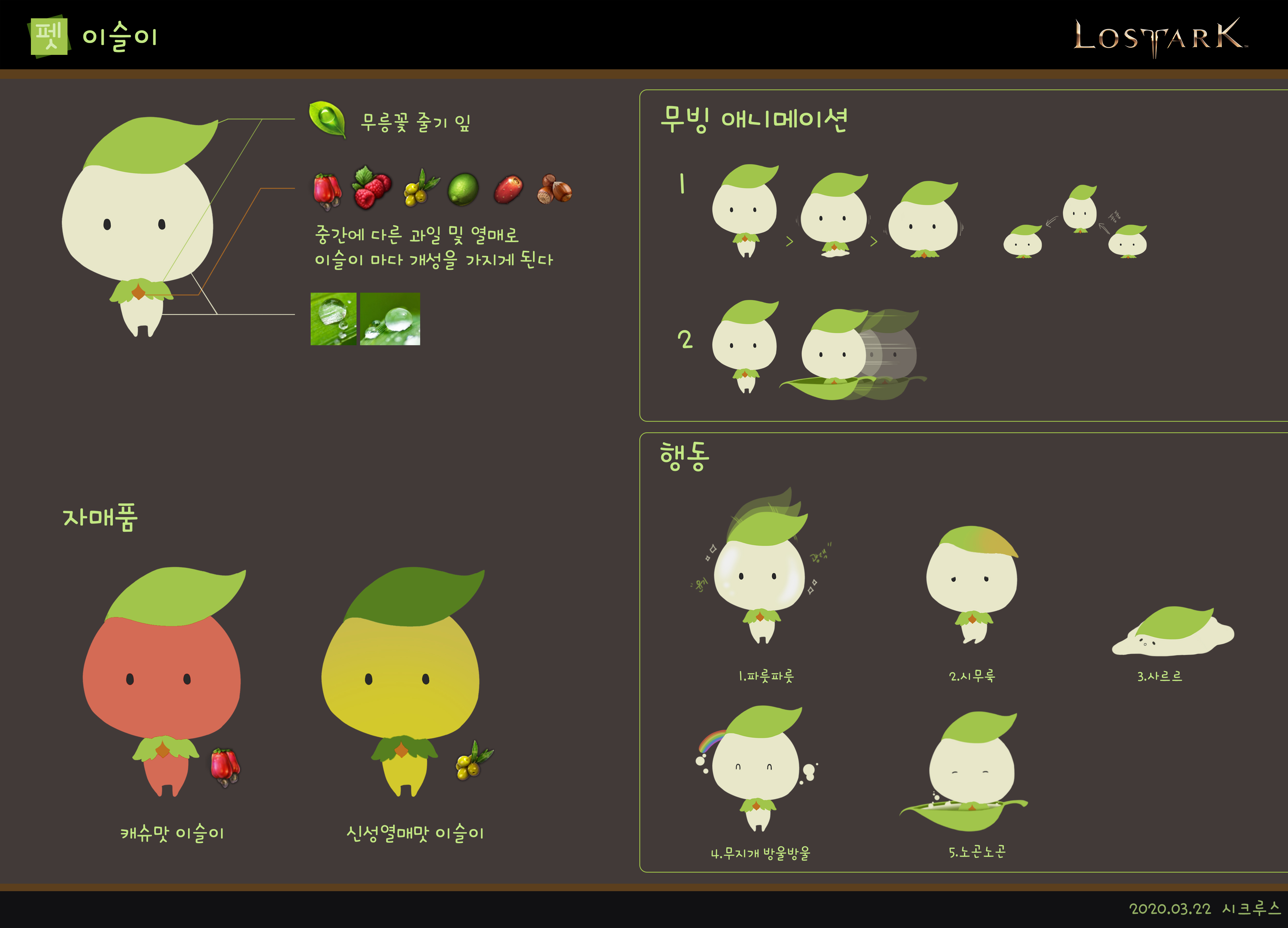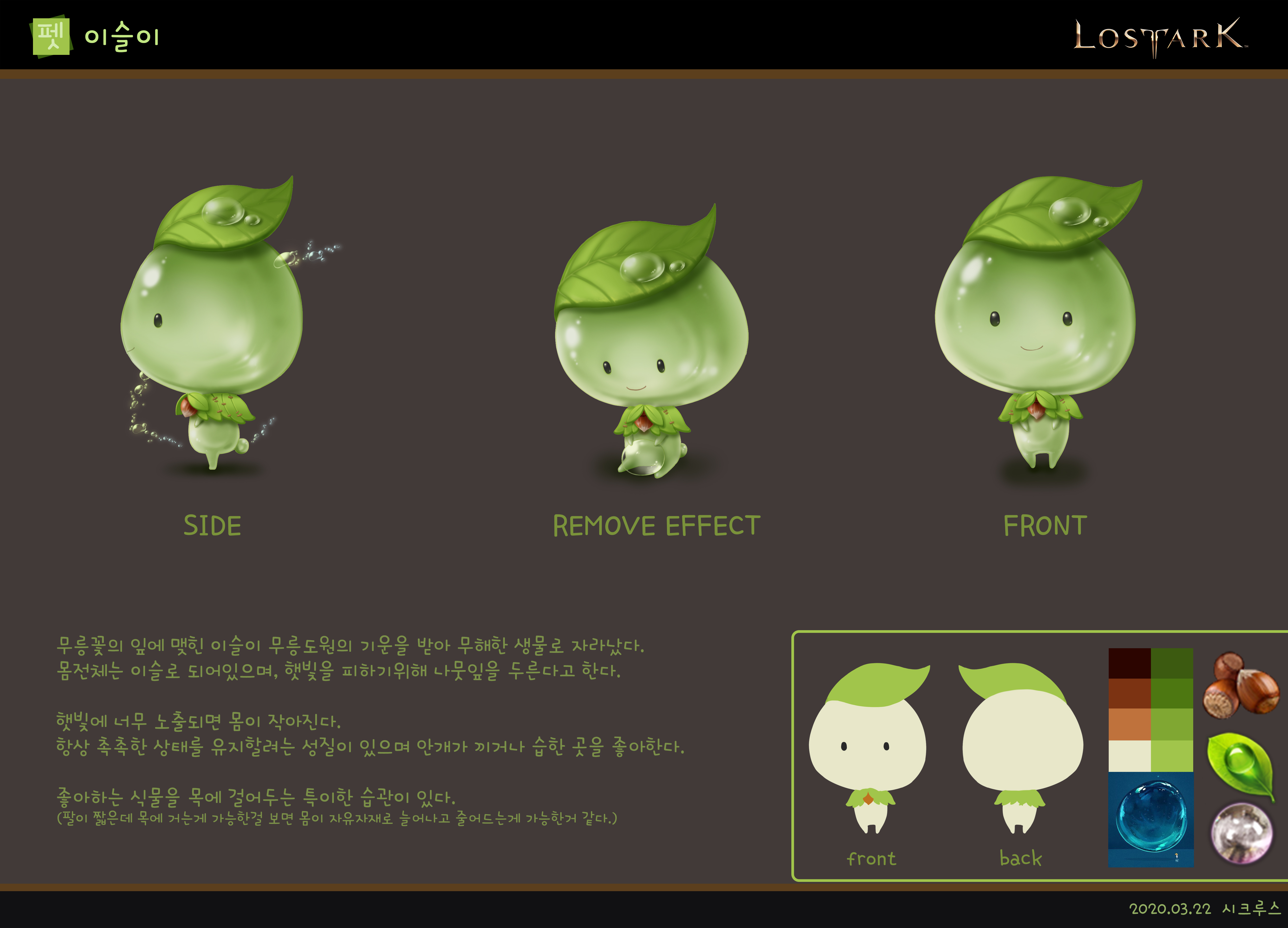 무릉도원의 청량한 기운을 받고 자라난 생명체라는 컨셉입니다. (소재 아이템: 무릉꽃의 이슬)