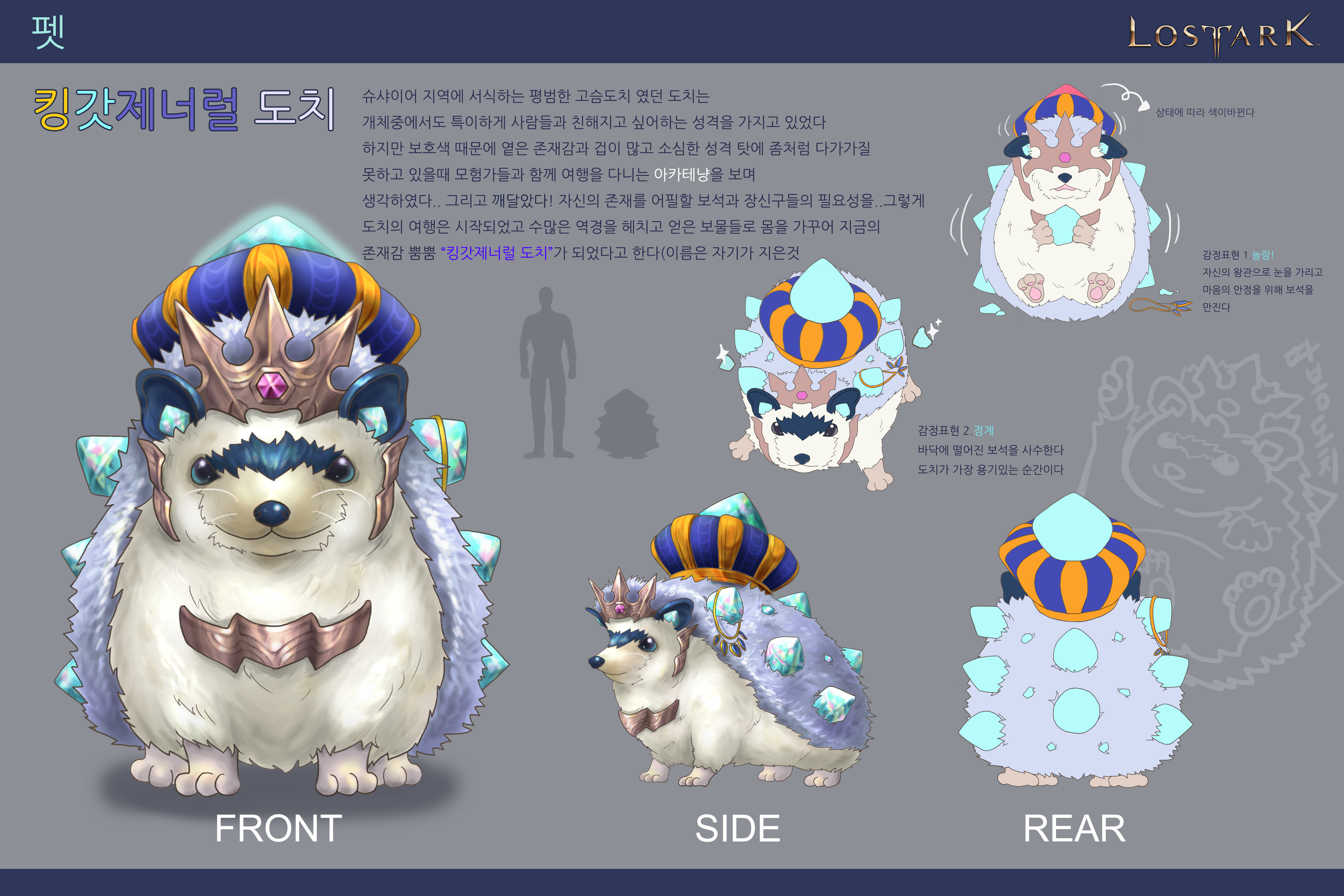 반짝이는 물건을 좋아해서 누구보다 아이템을 잘 찾고 줍줍을 잘한다는 컨셉과 고슴도치를 합쳐 만들어봤습니다