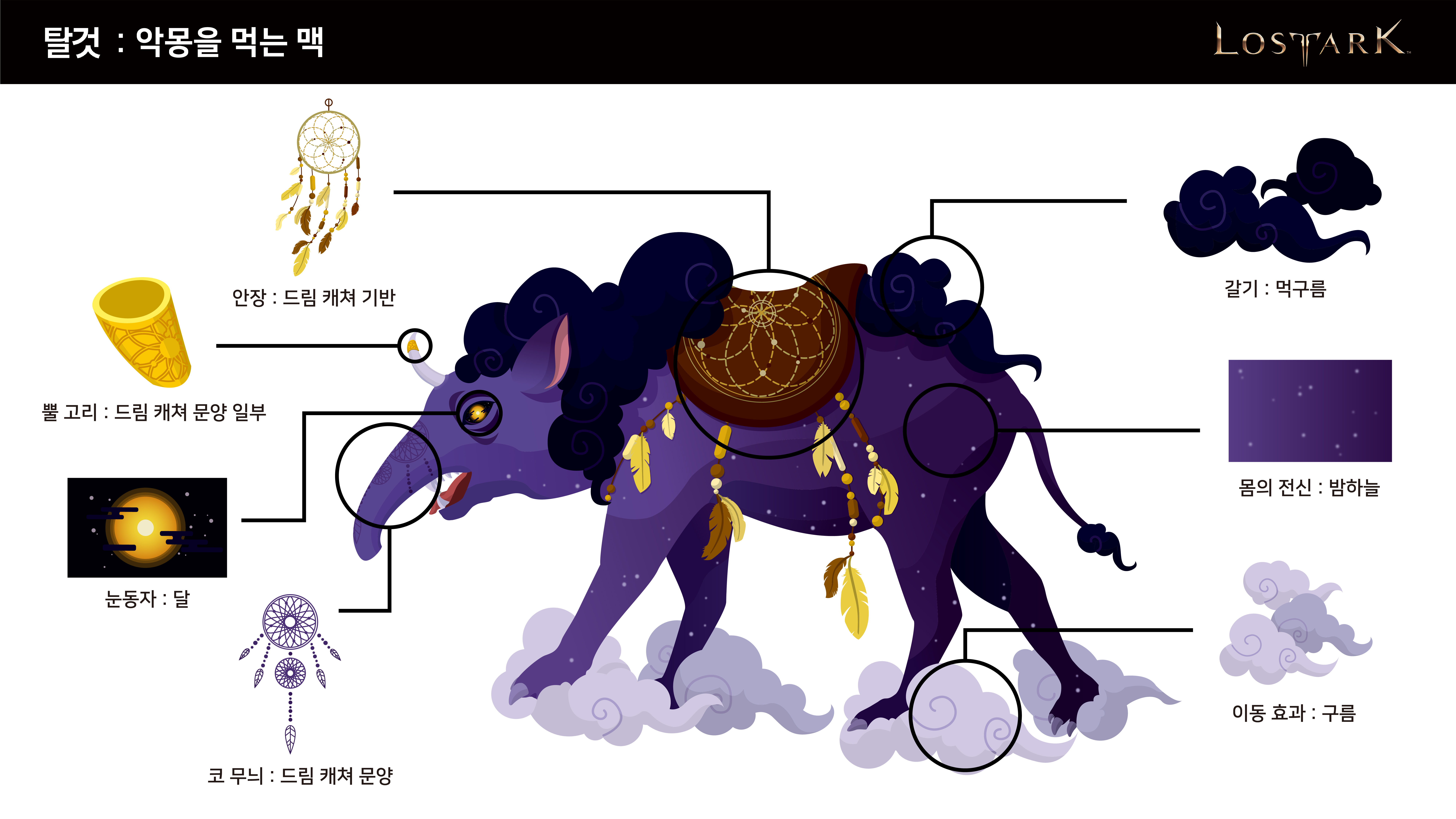 -마찬가지로 디자인 컨셉도 악몽/꿈/밤이다. 밤하늘의 달과 구름, 악몽을 쫓는 드림 캐쳐 등을 기반으로 디자인했다. 양을 세는 수면법을 참고하여, 구름 갈기로 양의 이미지를 떠올리도록 의도했다.