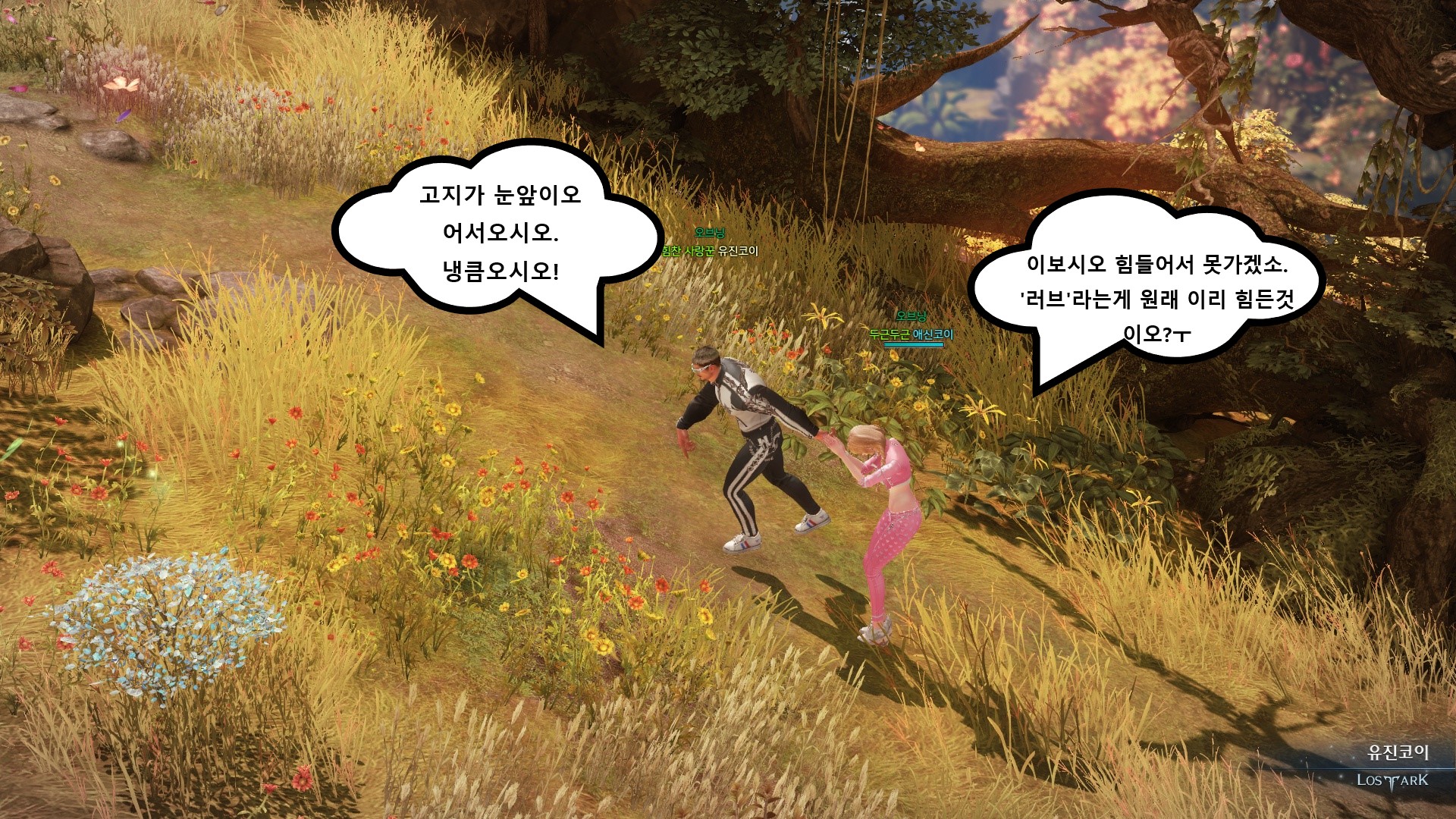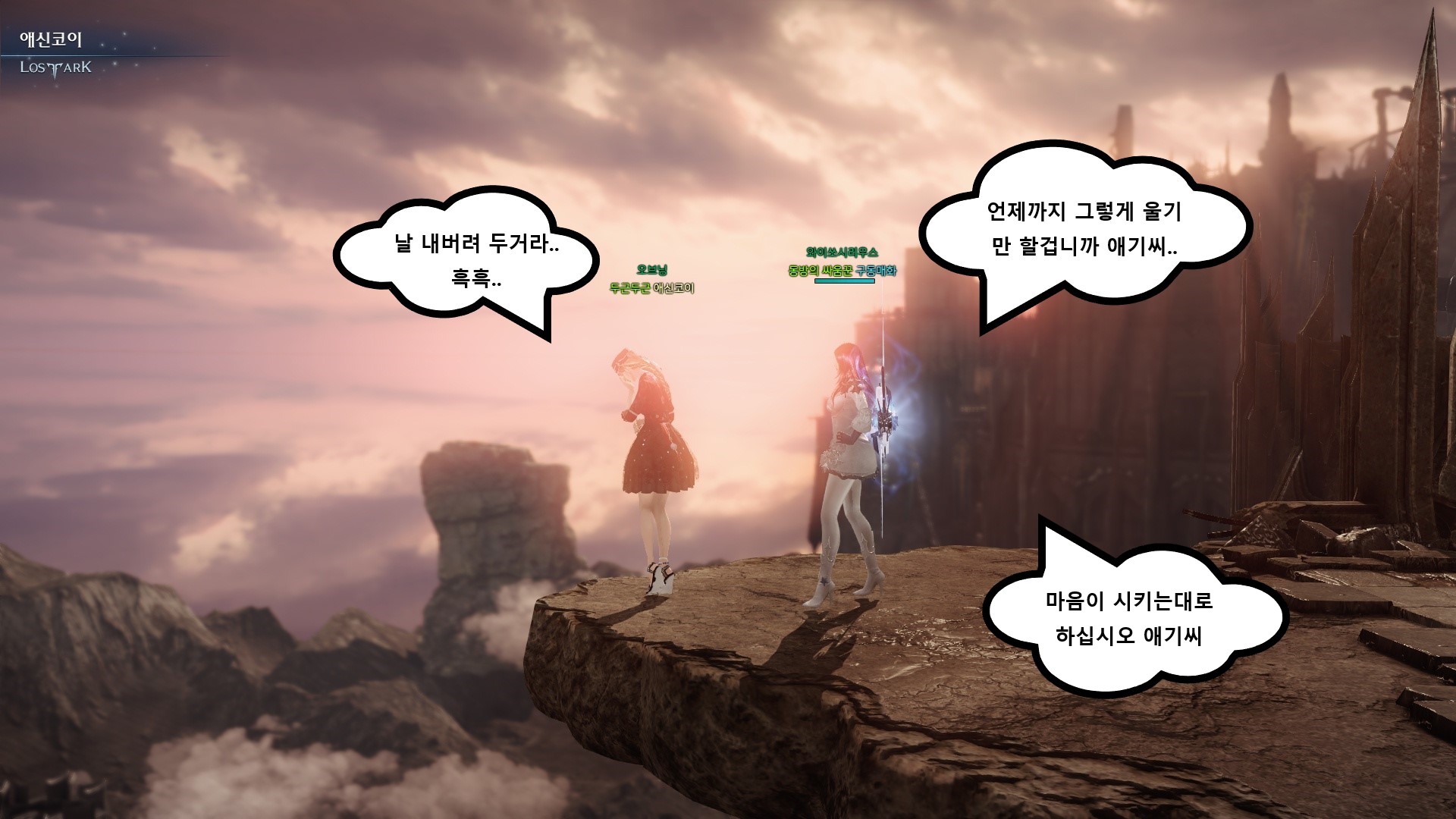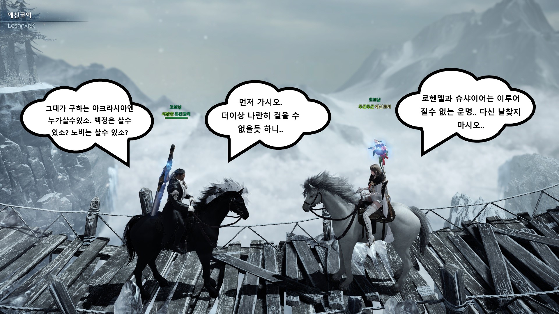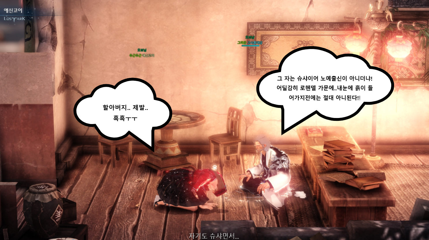 안녕하세요~! 카마인서버에서 애신코이(서머너), 유진코이(버서커)를 하고있는 실제커플유저입니다. 미스터선샤인이란 드라마를 감명깊고 재밌게 본 뒤 바로 로아를 시작하다보니 아이디도 위처럼 만들었는데요ㅎ('초이'는 이미 있더군요ㅜㅋ) 이번 셀피 콘테스트를 통해 미스터 선샤인 컨셉으로 명장면, 명대사를 패러디해서 재미있는 스토리를 짜봤습니다. 다소 엉성하더라도 재밌게 봐주세요~^^!