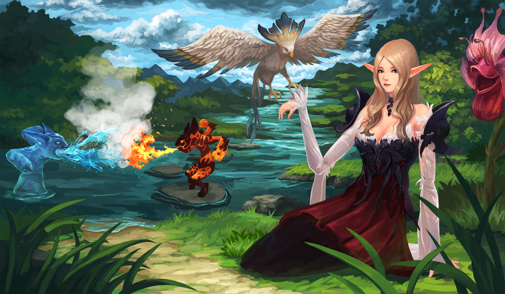 본케 서머너가 소환수들과 함께 여유로운 휴가를 보내는 장면을 그려봤어요 ㅎㅎ