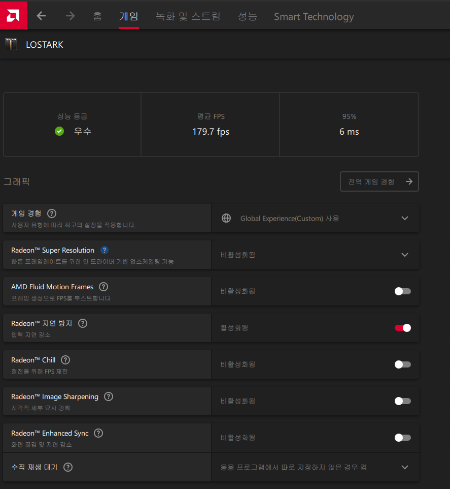 라데온 게임란에 로아 등록후 위와 같이 설정 하면됨