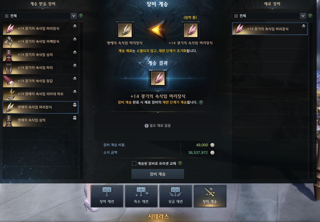 아브렐슈드 장비로 계승하려 합니다. 근데 왜 계승해도 쿠크 장비로 뜰까요?