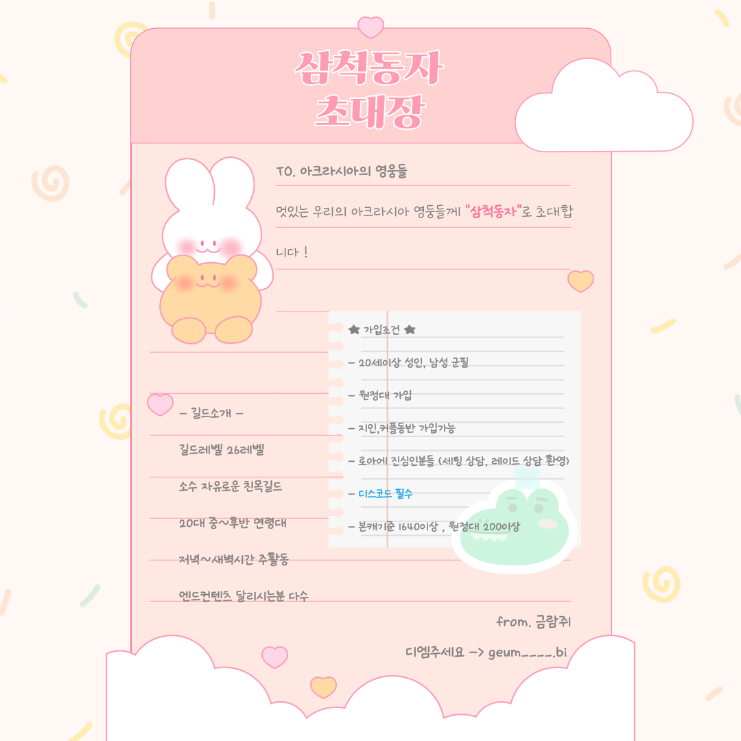 기본매너있으시면 터치없이 비교적 자유로운 친목길드입니다 !
