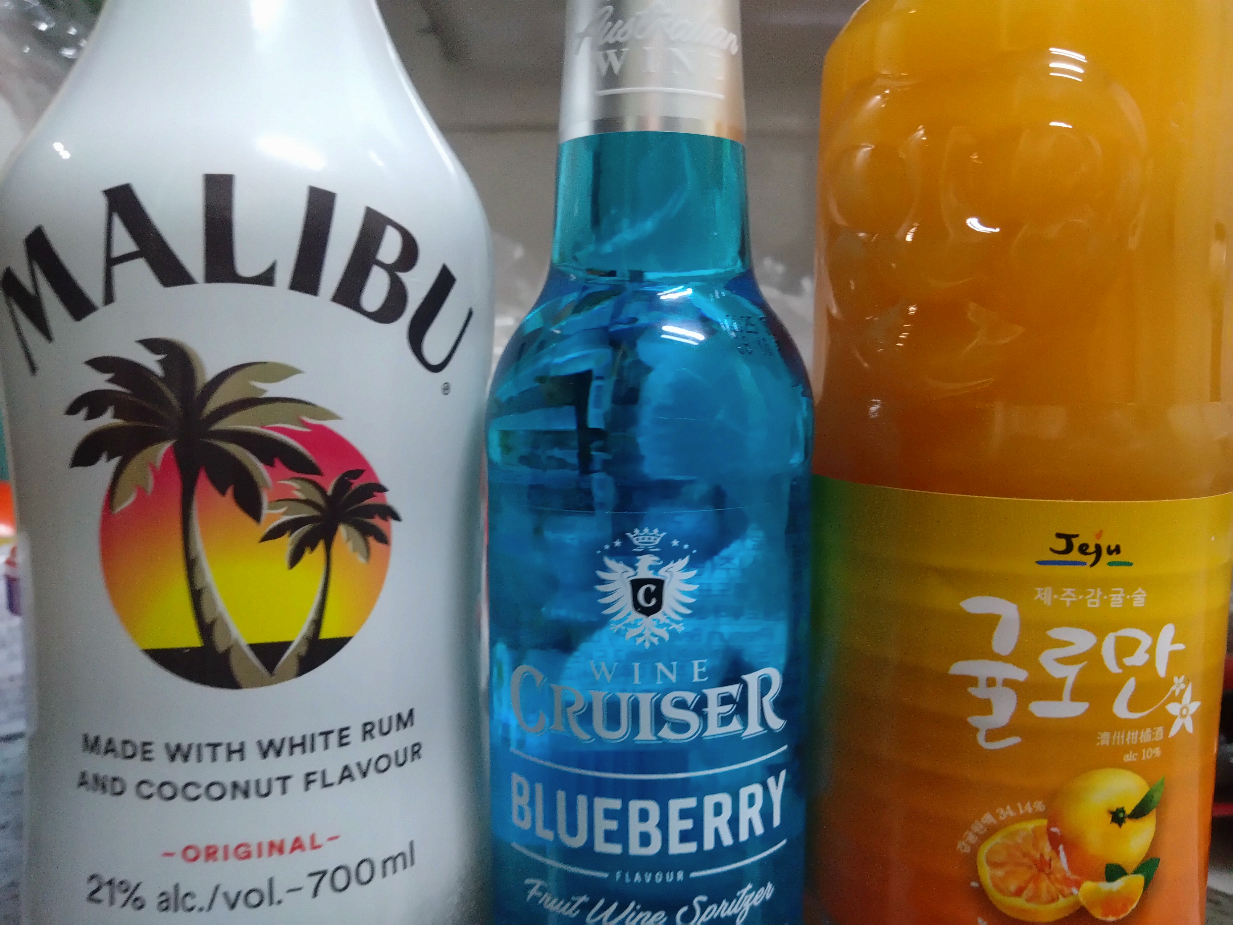 왼쪽부터 말리부, 클루저 스파클링 블루베리 와인. 이번에 사본 귤주