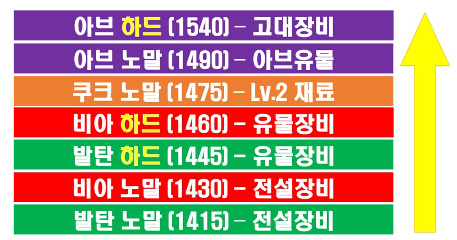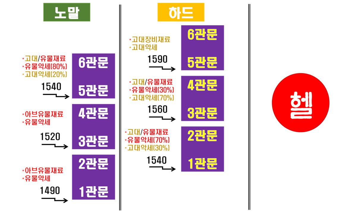 노말 난이도만 클리어하는 방식은 5,6관문부터 고대장비를 준비할 수 있고,