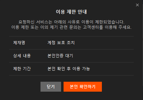 저렇게 이용 제한 안내 문구가 계속 떠요 발생 시간은 어제 제가 게임을 삭제하고 ssd로 다시 깔았을 때부터 뜨기 시작했습니다. 본인인증 했는데도 계속해서 뜨고요 프로그램 건든 것도 nividia 제어판 건든 것 말고는 없습니다. otp, 해외접속 차단, 지정pc 다 했는데 계속 떠요. 제가 평소에 인게임에서도 버그 악용한 것도 아니고 매일 하는거라곤 숙제하는게 끝인데;; 혹시 저랑 같은 문제 겪으신 분 없나요? 해결 하셨거나 어떻게 대처 하셨는지 궁금합니다.