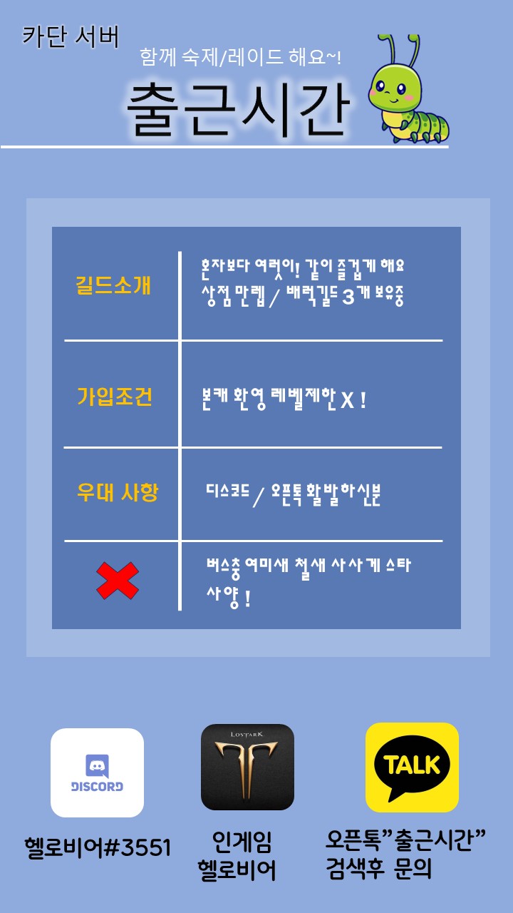 - 디스코드 참여 필수(원할한 레이드 소통을 위해서입니다)듣톡가능