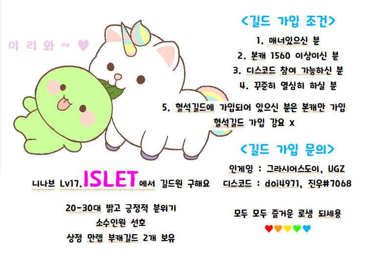 니나브 lv 19 [islet] 친목길드에서 함께할 길드원을 모집합니다 ♥ 많관부