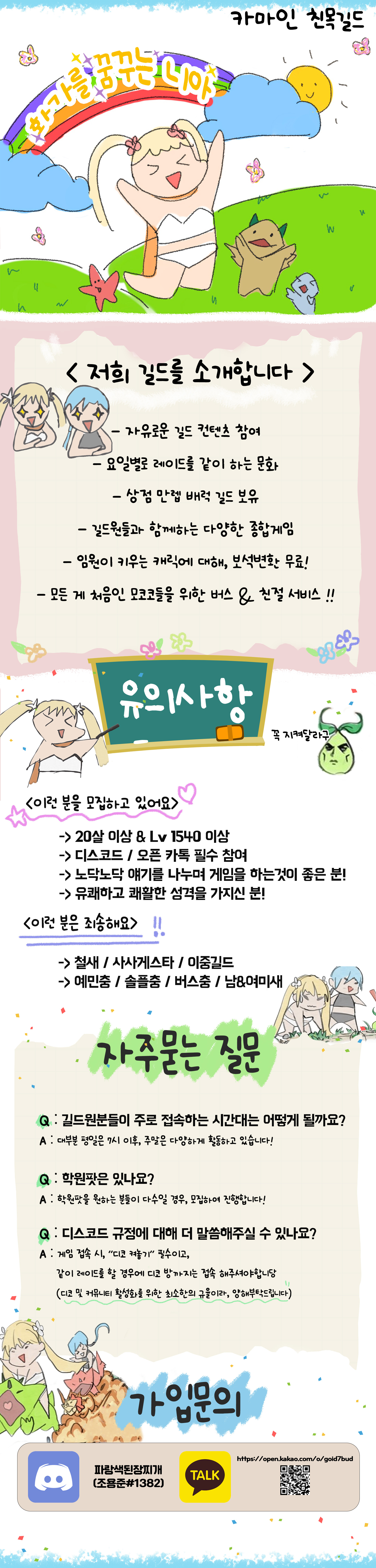 유쾌하고 친절한 사람들끼리 길드를 만들어 함께 즐기고 싶어서 모집을 하게 되었습니다!!