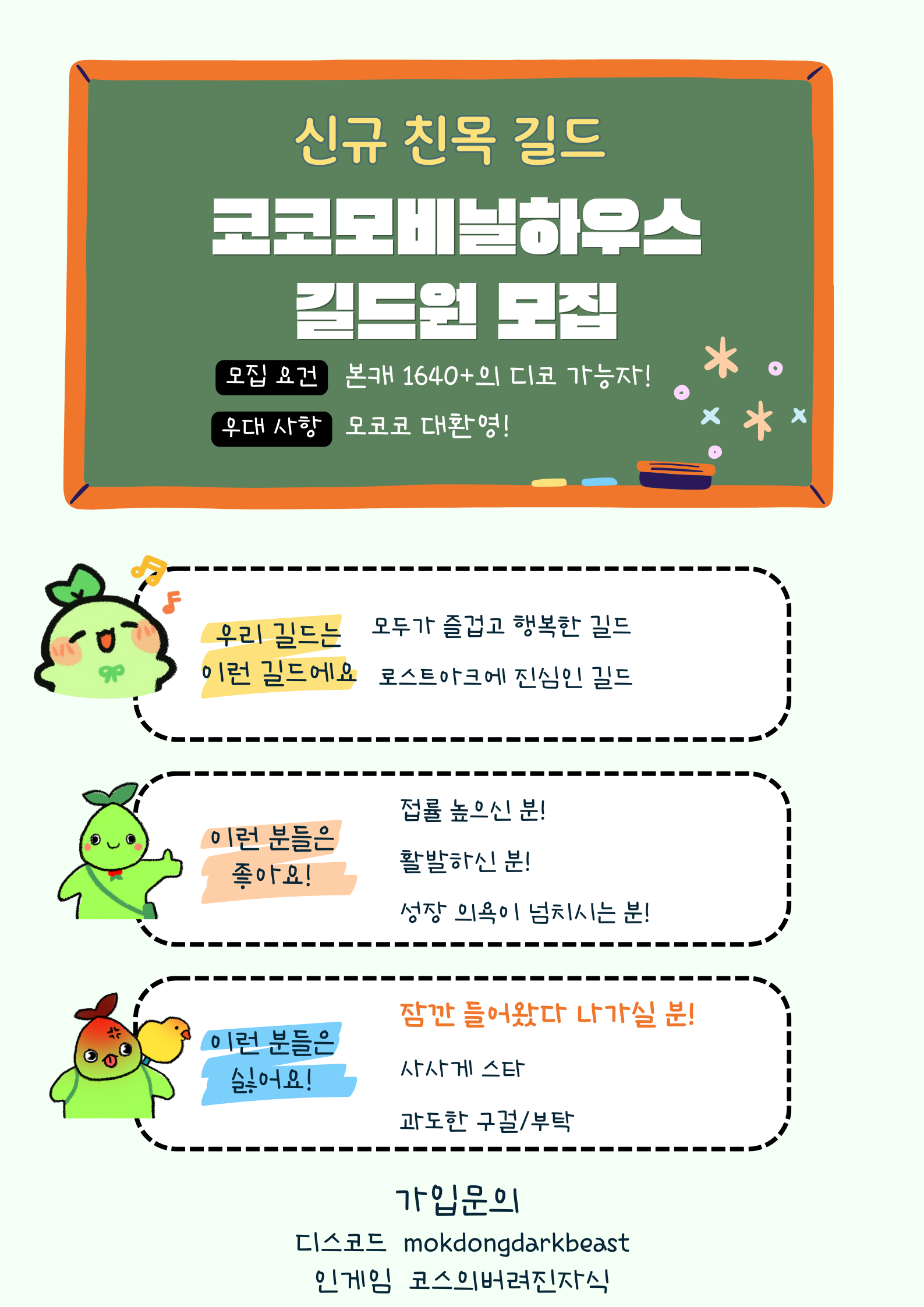 니나브 신규 친목길드 Lv25(진) 코코모비닐하우스에서 길드원을 모집합니다!