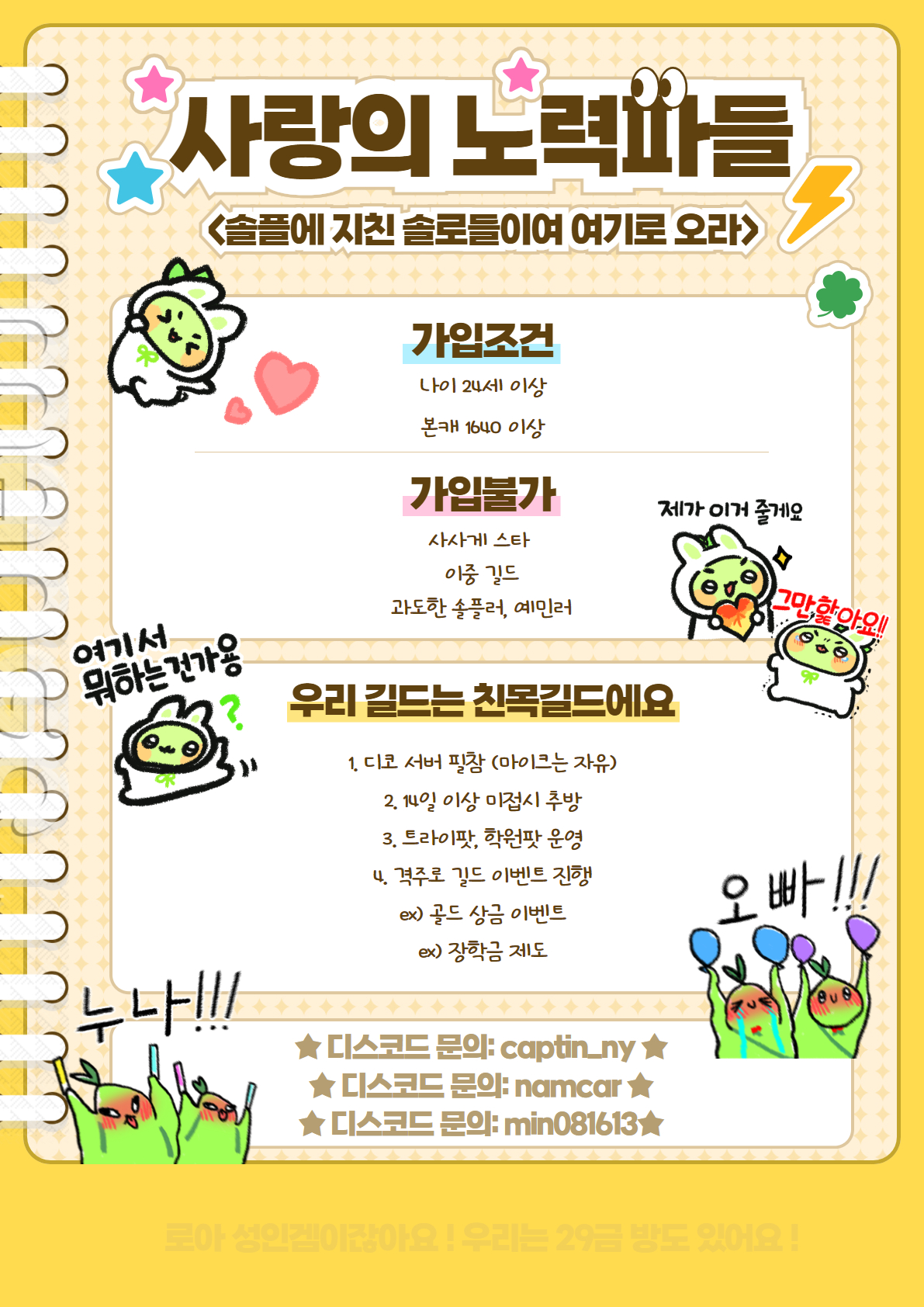 ❤️ 아직 길드원 몇 없는 응애 길드에요! 같이 성장해 나갈 여러분들을 기다리고 있습니다!