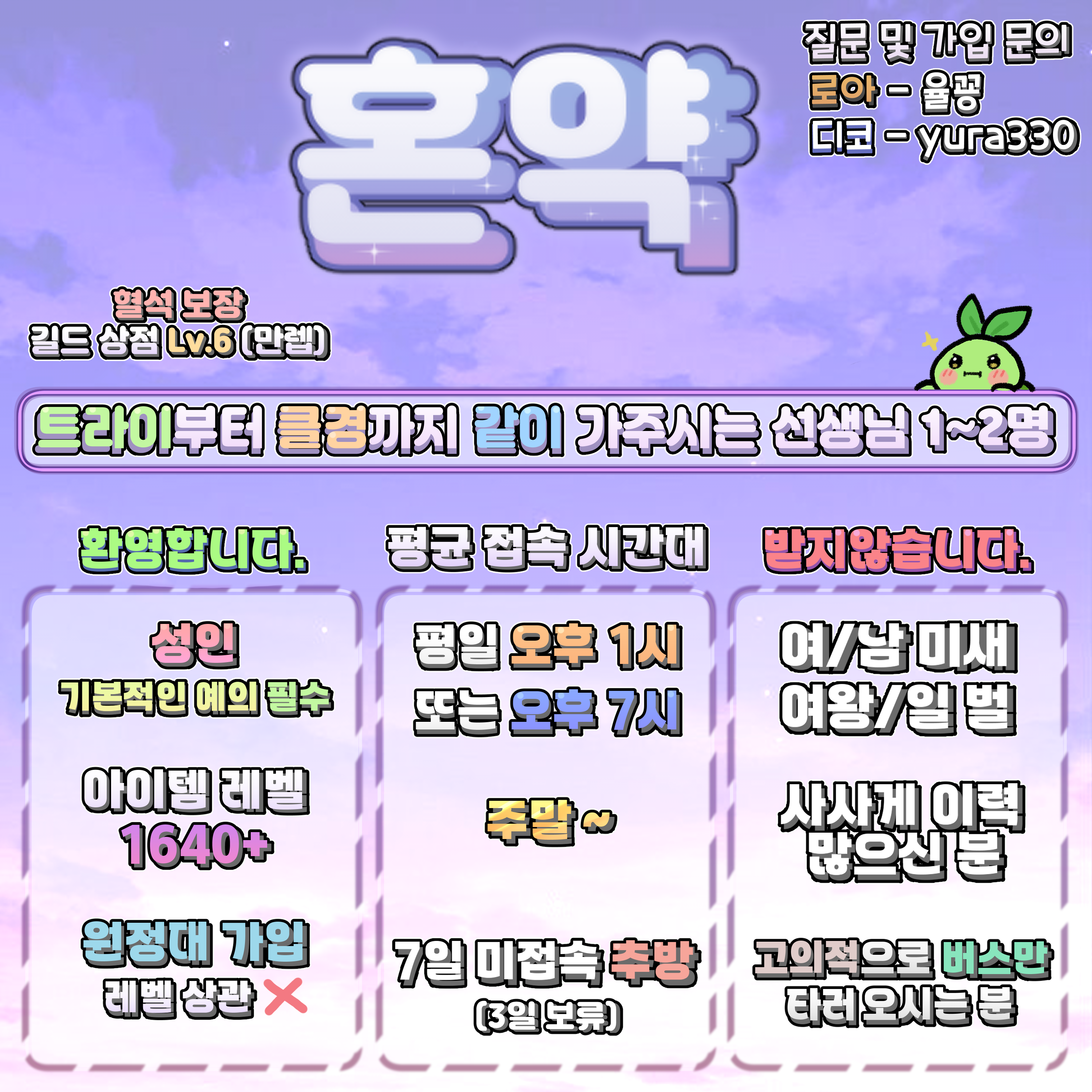 카마인 카마인 【혼약】 같이 레이드 할 길드원 모집 ! 1640+ 상점만렙, 혈석보장 (뉴비/복귀 환영 :D)