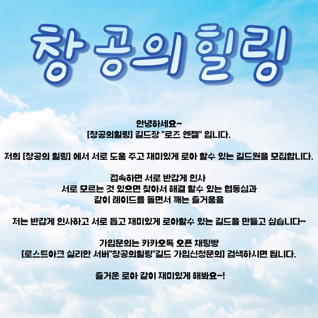 [로스트아크 실리안 서버"창공의힐링"길드 가입신청문의] 검색하시면 됩니다.