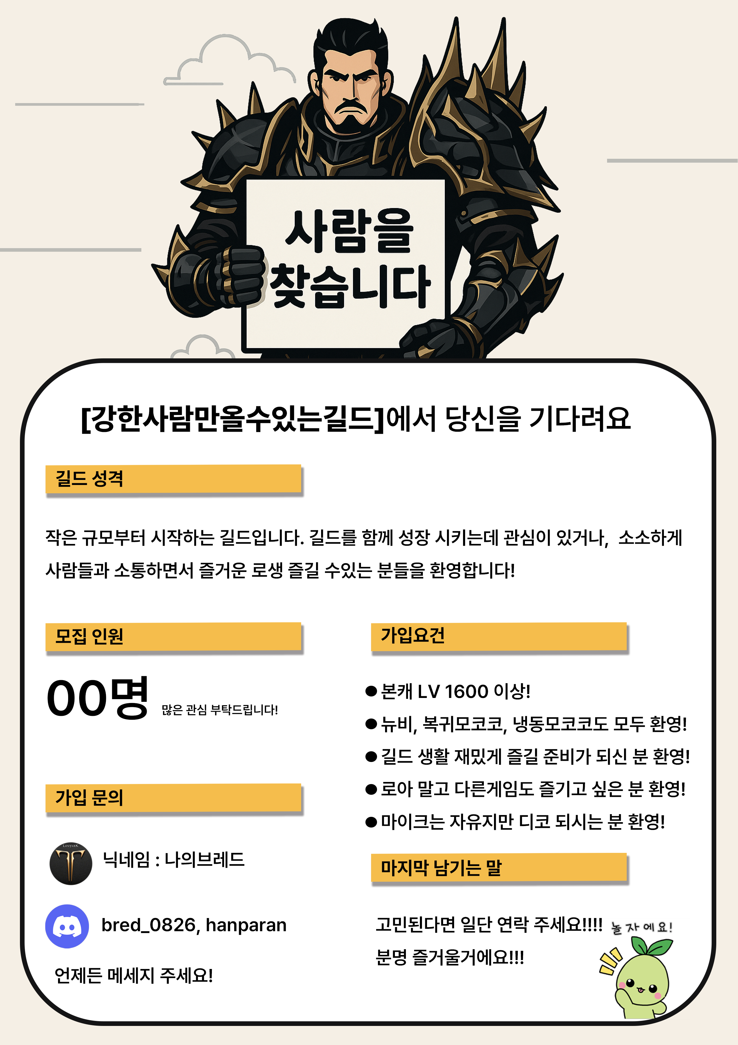 작은 길드에서 차근차근 같이 성장하고 싶은 분들을 기다리고 있어요!