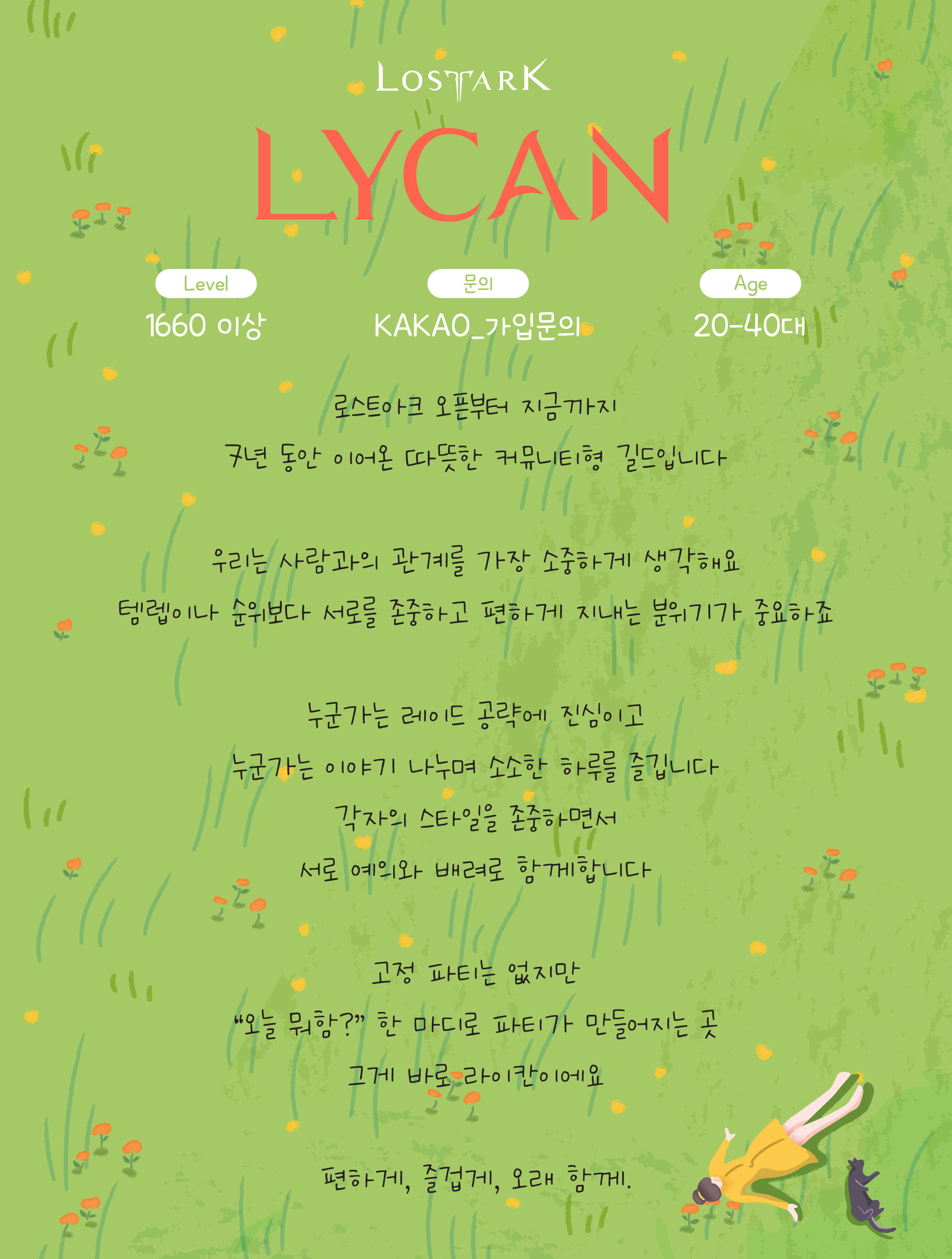 LYCAN은 각자 스타일을 존중하는 커뮤니티 중심 길드입니다