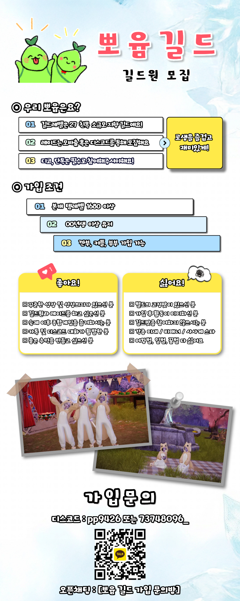 ✨ 길드 가입문의 : (디스코드) pp9426 or 73748096_ // (오픈채팅방) 검색 창에 '뽀윰 길드'(띄어쓰기) 검색