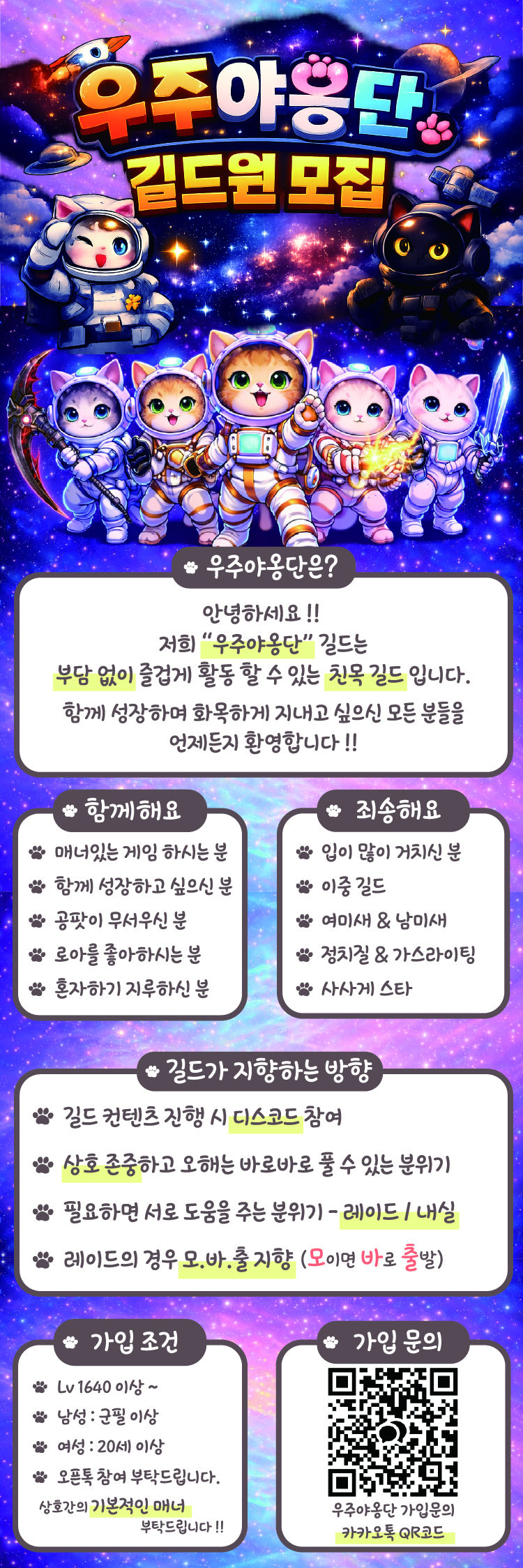 Lv.30 카제로스 친목 길드 [우주야옹단] 에서 신규 길드원을 모집합니다😺