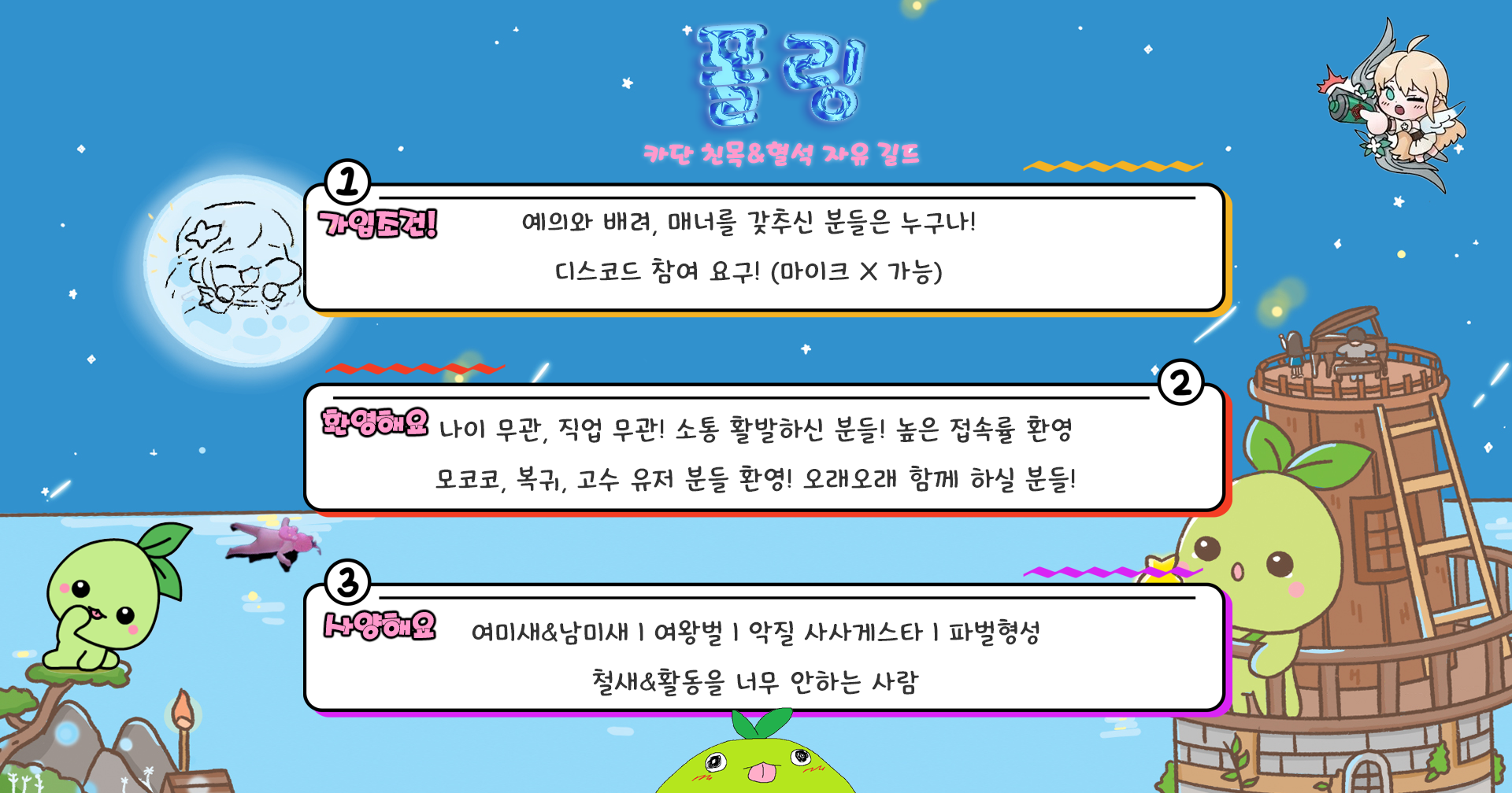 - 강제·파벌적인 친목 X! 조용한 길드 X! 자유롭고 소박하게 지낼 수 있는 환경 마련!