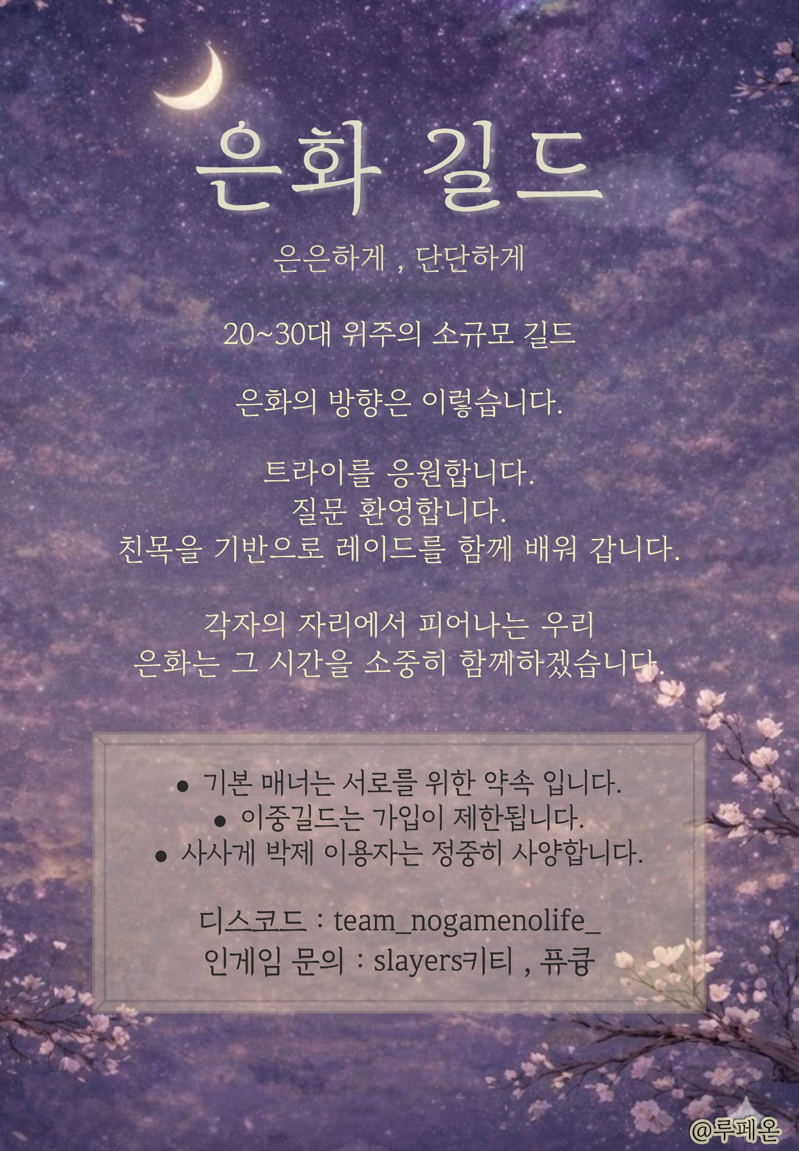 화려하지는 않아도 오래 머물 수 있는 편안한 길드를 지향합니다.