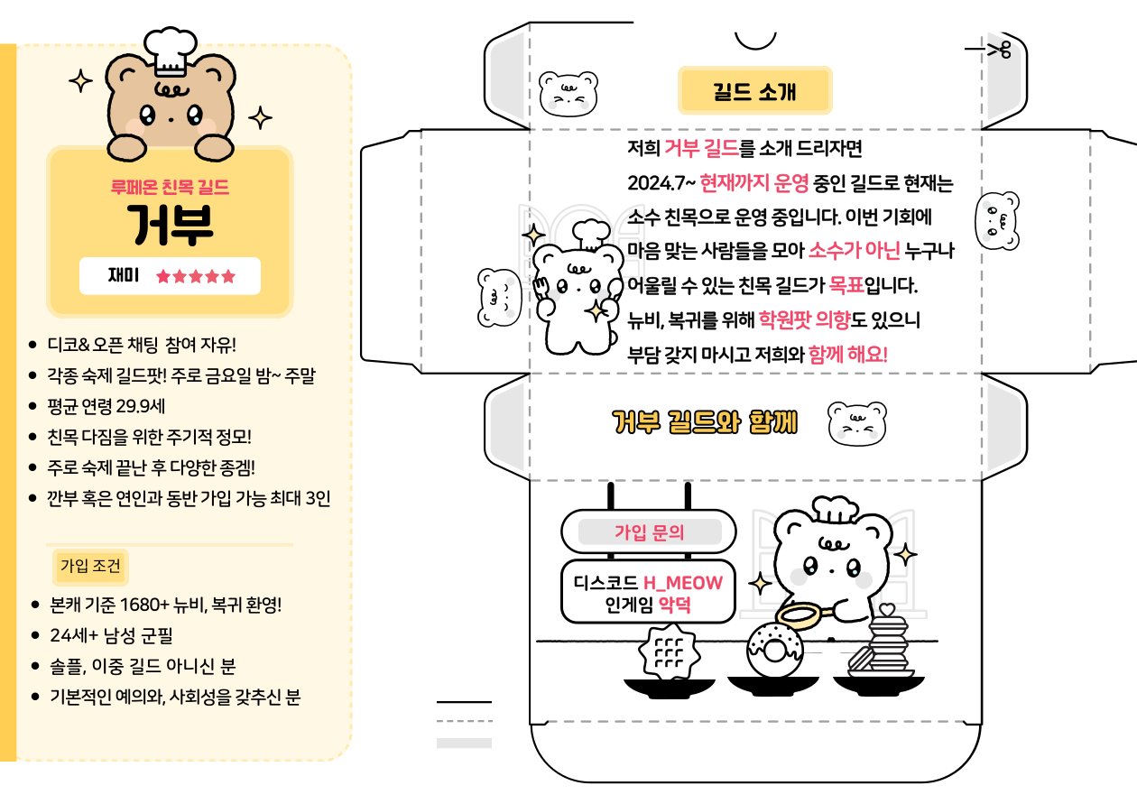 루페온 저희 길드를 뽑아주신다면!!!!! 모두가 행복한 로생을 즐길 수 있도록 노력하겠습니다 기호 1번 <거부> 새 글