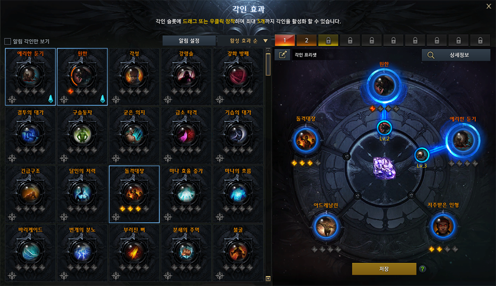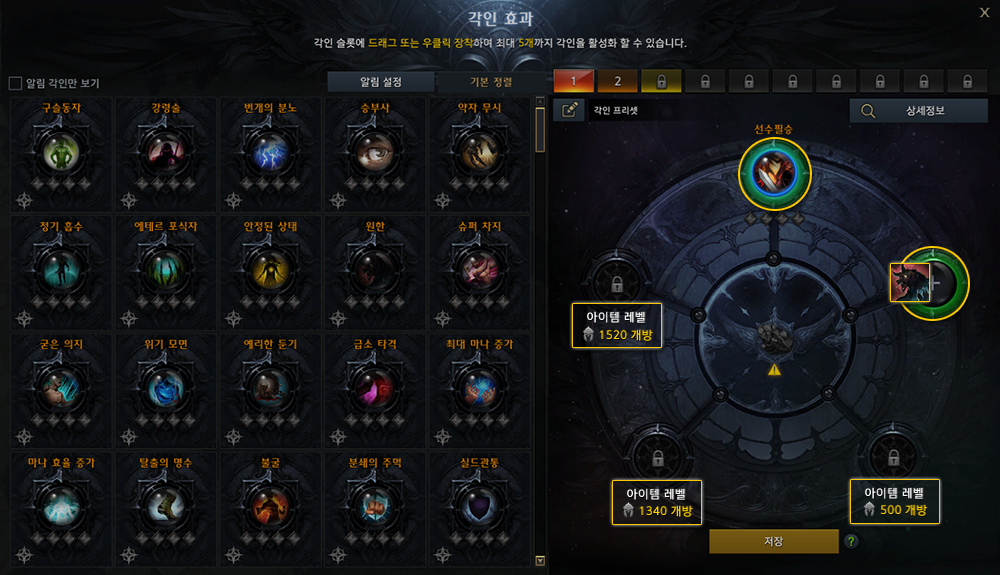 각인을 각인 슬롯에 드래그 또는 우클릭하여 장착 후 [저장] 버튼을 클릭하면, 각인 효과가 적용됩니다.
