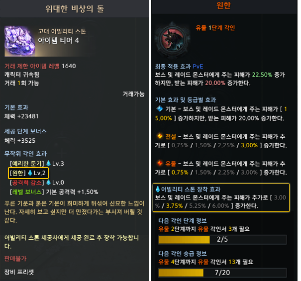 - 어빌리티 스톤에 부여된 각인이 원한, 예리한 둔기인 경우 : 원한, 예리한 둔기 각인 효과가 모두 적용됩니다.