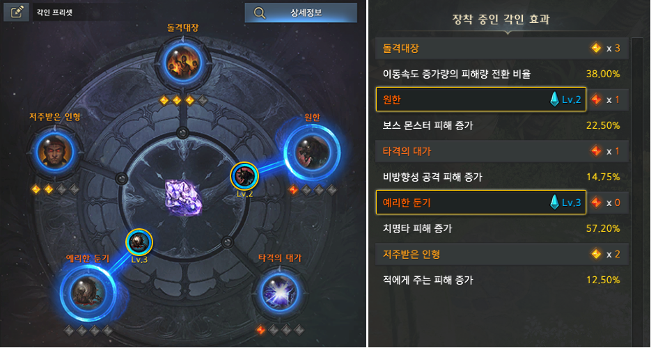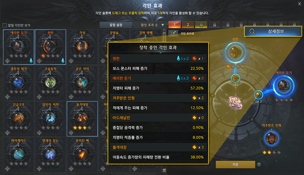 장착 후 캐릭터에 적용 중인 각인 효과는 [상세 정보] 버튼을 통해 확인할 수 있습니다.