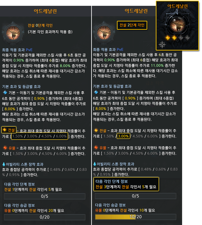 ▲ 기본 각인 효과 상태(왼쪽)와 전설 등급 각인서 10장을 읽었을 때 2단계 효과가 활성화된 모습(오른쪽)입니다.