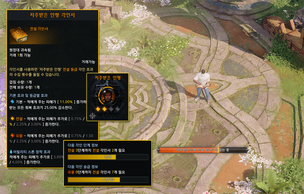 ※ 현재 수집 중인 각인서 보다 높은 등급의 각인서는 사용이 불가능합니다. - 각인서 습득을 통해 변경되는 '각인 효과' 정보는 원정대 단위로 공유됩니다.