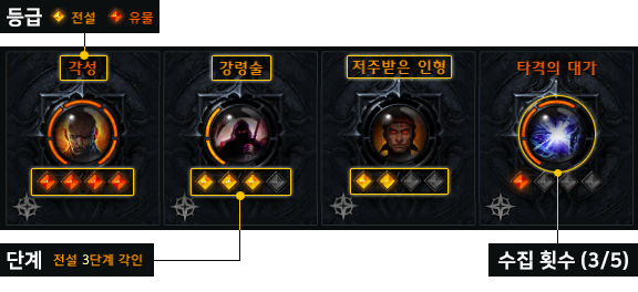 - 이후 각인서 아이템을 획득하여 사용 시 각인서의 등급 및 단계에 따라 수집 횟수가 증가합니다.