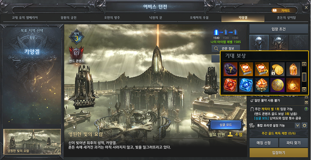 • 각 어비스 던전 입장 조건에 해당하는 아이템 레벨 달성 및 선행 퀘스트 진행 필요.