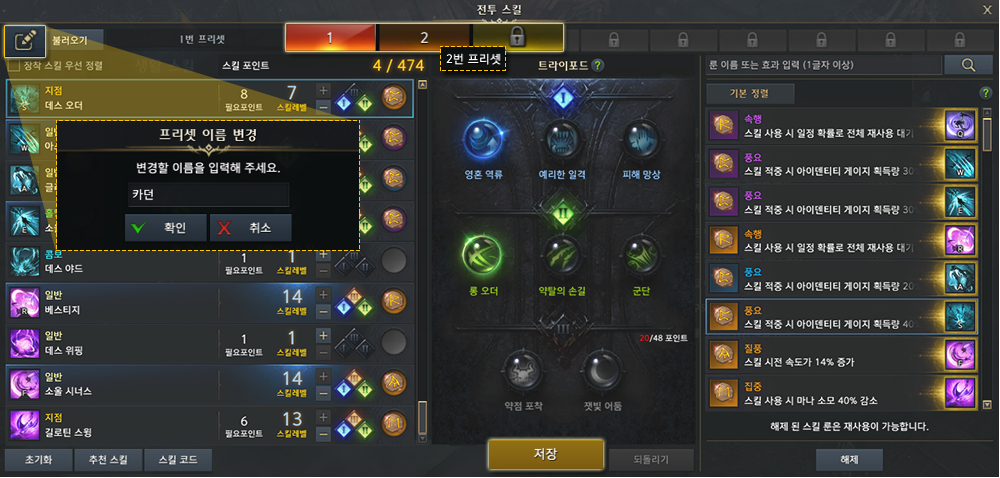기본적으로 2개의 스킬 프리셋을 제공하고 있지만, 필요에 따라 프리셋 개수를 확장할 수 있습니다.