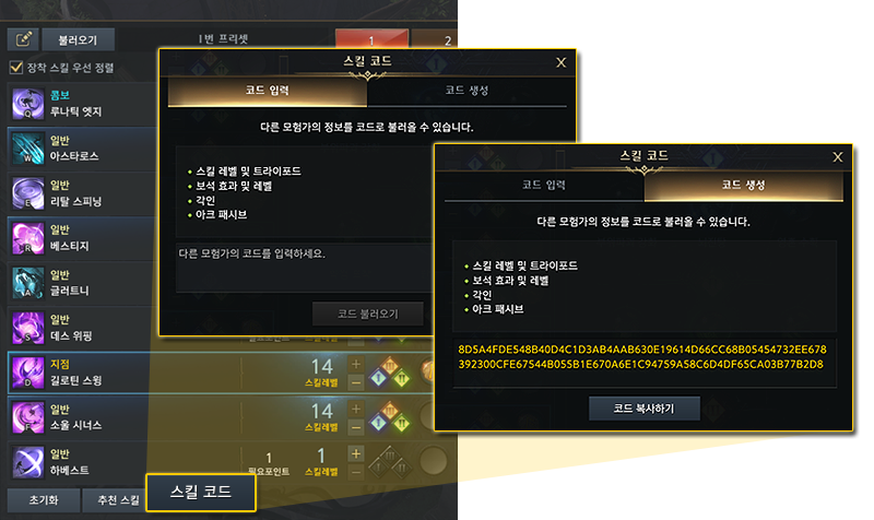 - 생성된 스킬 코드를 입력하면, 대상 캐릭터의 전투 세팅 정보를 복사하여 불러올 수 있습니다.