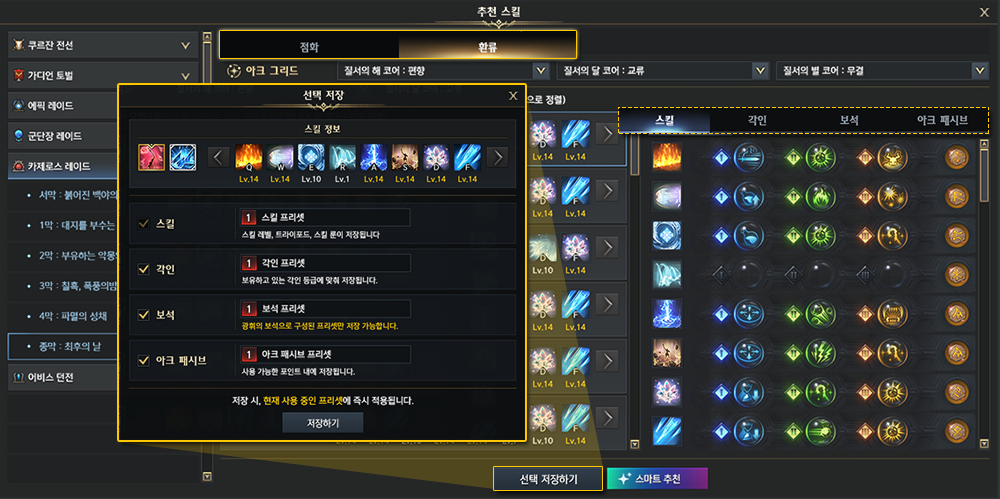 ※ 추천 스킬을 저장하여 나에게 적용할 시, 현재 적용 중인 프리셋 설정이 변경되니 변경하고자 하는 프리셋을 확인 후 이용해주시기 바랍니다.