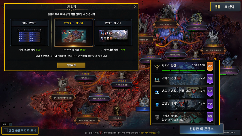 - 카제로스 전장판을 사용 중인 상태에서도 동일하게 'UI 선택' 버튼을 통해 기존 콘텐츠 목록 구성 방식으로 변경이 가능합니다.