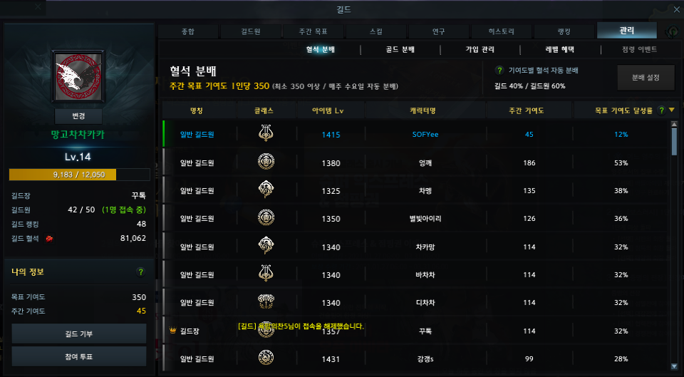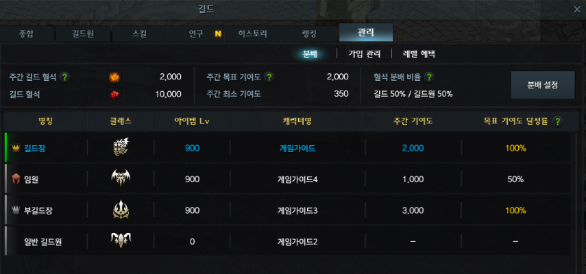 위 링크에서보면 길드창에서 관리탭 - 분배 에서 주간길드혈석과 주간목표기여도 주간최소기여도 등을 볼 수 있었던것 같은데