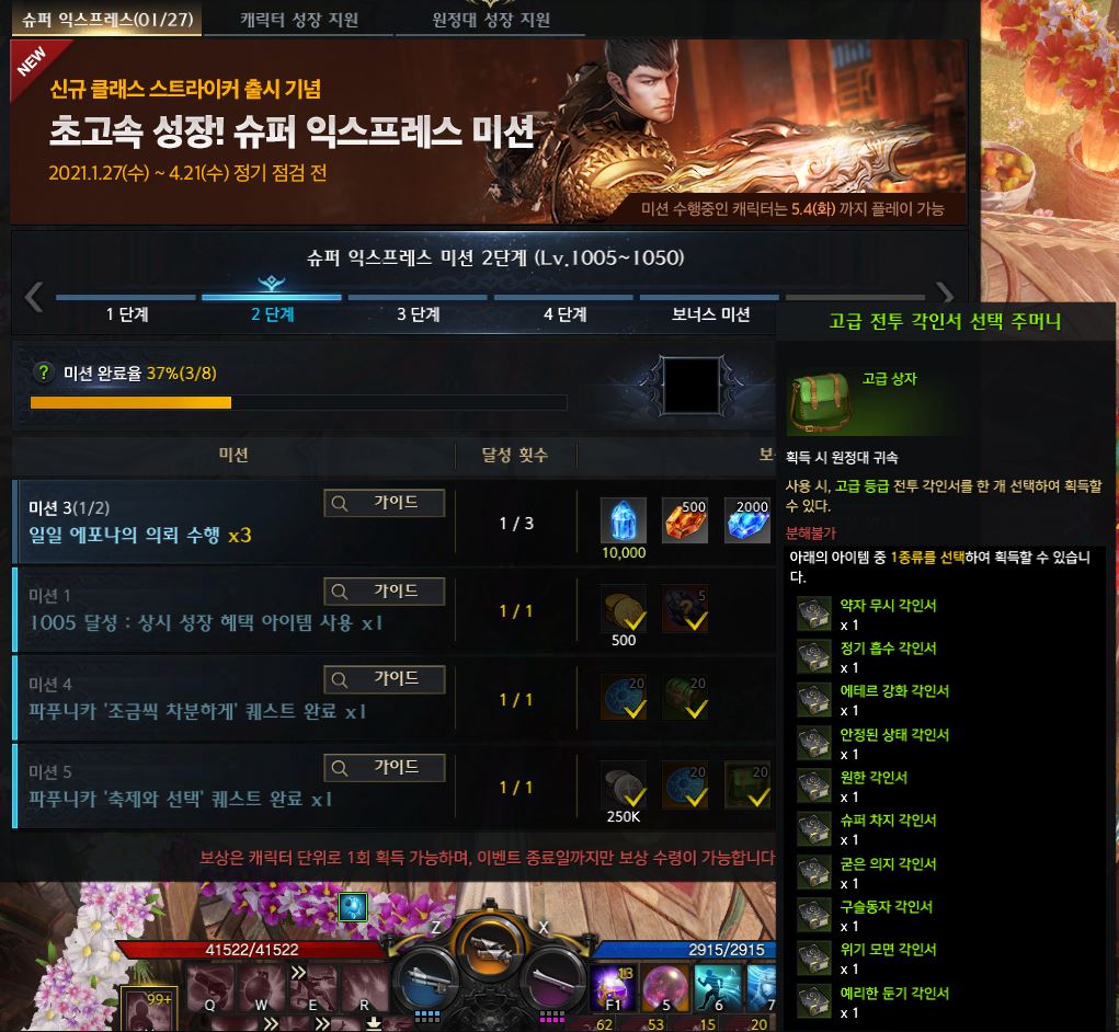 슈퍼 익스프레스 보상 중 파푸니카 스토리를 완료하면 주는 고급 각인서 선택 주머니가 있는데요.