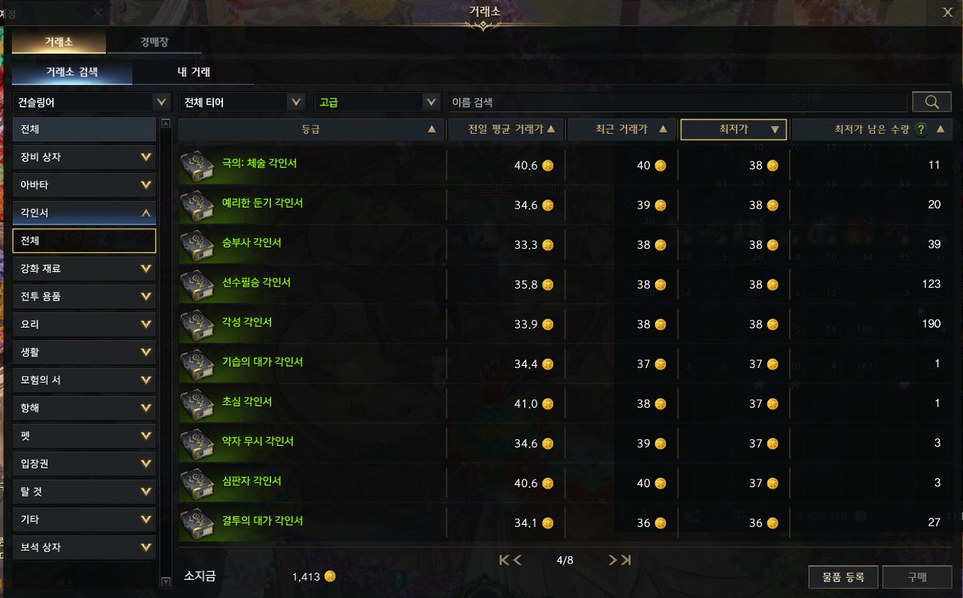 우선 거래소에서 가격이 높은 전투각인서를 받아 팔고, 팔린 금액으로 원한을 20장 사셨으면 합니다.