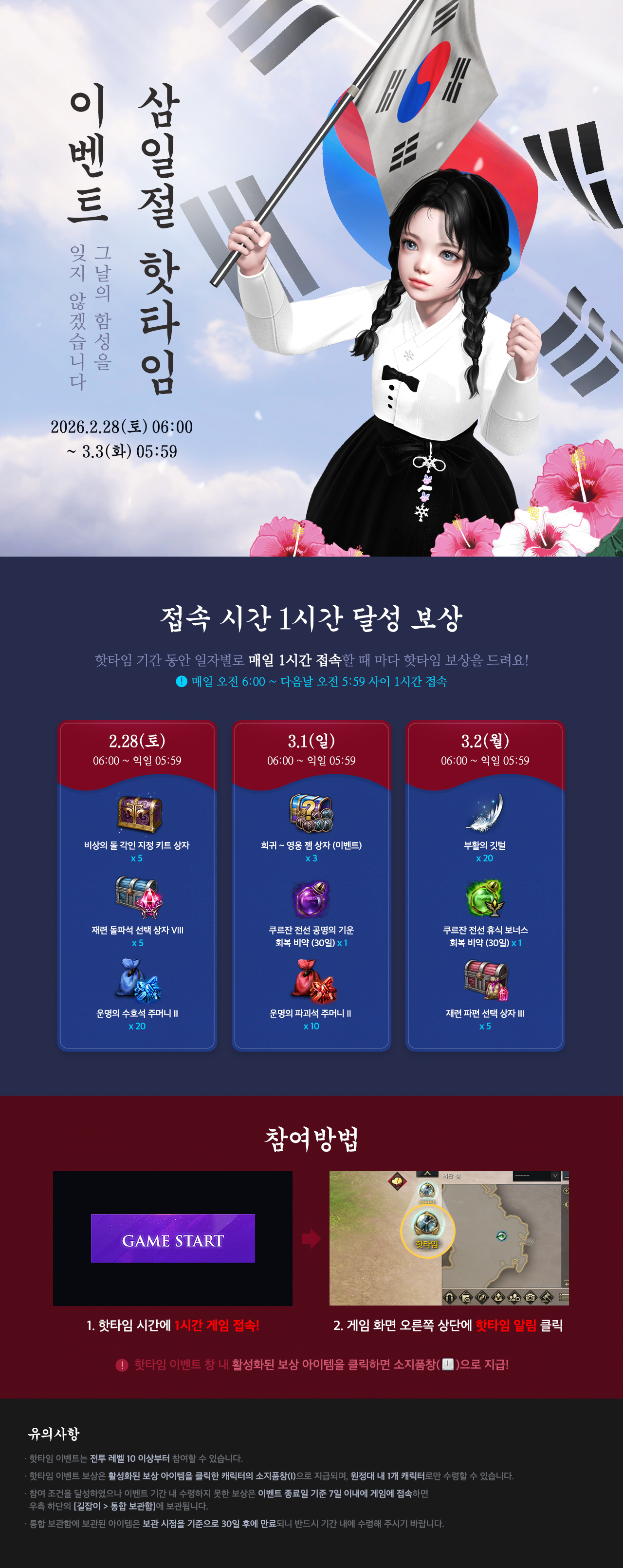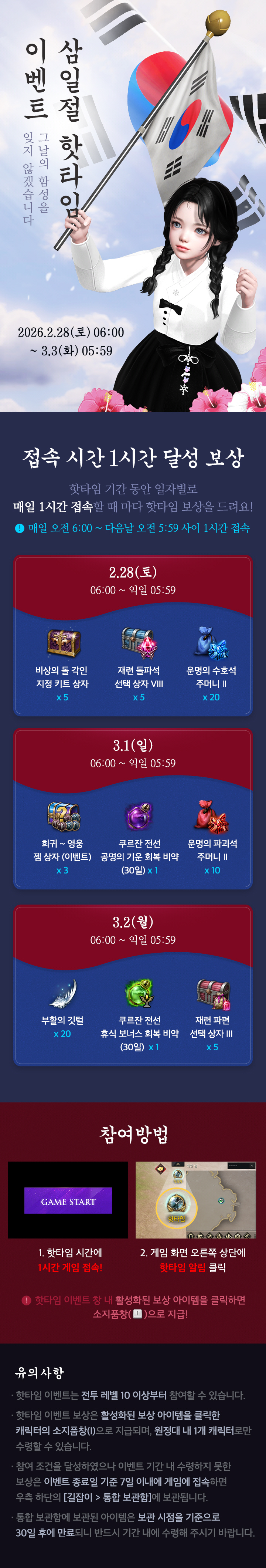 목록가기 이벤트 삼일절 핫타임 이벤트 안내 새 글 2026.02.25 09:59 LOST ARK 조회수 28,406 공유 페이스북 공유하기 트위터 공유하기 카카오톡 공유하기 URL 복사하기 알려진 이슈를 안내해 드립니다. (2/25 수정) 2월 25일(수) 신규 상품 및 확률 안내 목록보기